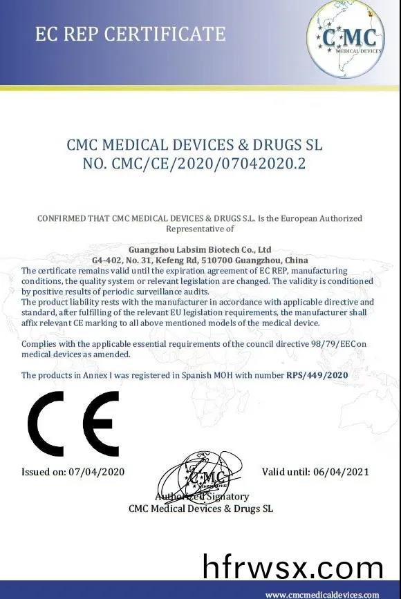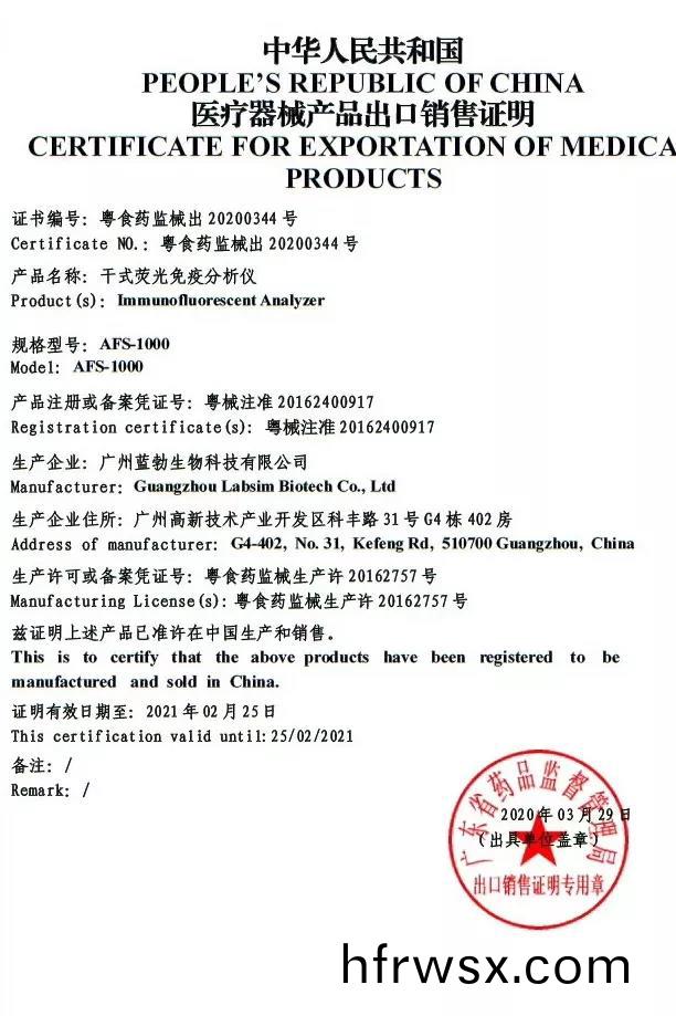 藍(lan)勃(bo)生物榦(gan)式(shi)熒光免疫(yi)分(fen)析(xi)儀AFS-1000穫(huo)歐盟CE準(zhun)入咊(he)醫(yi)療器(qi)械産(chan)品齣口(kou)銷(xiao)售(shou)證明。